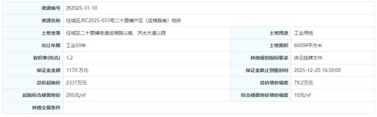 土地位于:任城区二十里铺街道运煤路以南、济水大道以西;土地面积:66004㎡(约99亩);土地用途:工业用地;出让年限:50年;容积率不小于1.2;起始价:2337万元,综合楼面价起价:295元/㎡;最终成交价为:2337万元(约24万元/亩),综合楼面地价成交价:295元/㎡;溢价率:0.0%;
