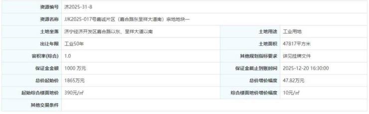 土地位于:济宁经济开发区嘉合路以东、呈祥大道以南;土地面积:47817㎡(约72亩);土地用途:工业用地;出让年限:50年;容积率不小于1.0;起始价:1865万元,综合楼面价起价:390元/㎡;最终成交价为:1865万元(约26万元/亩),综合楼面地价成交价:390元/㎡;溢价率:0.0%;
