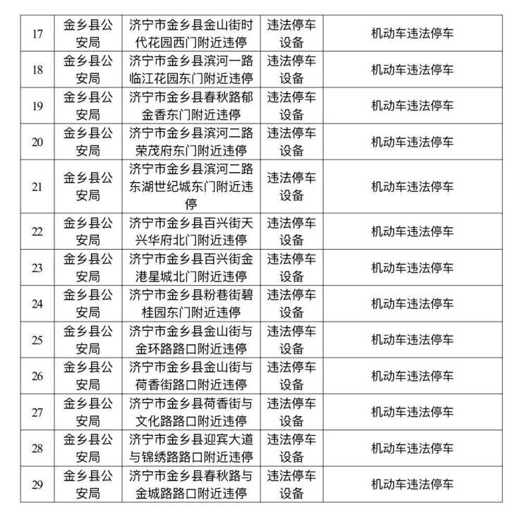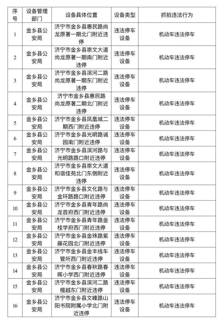 为维护道路交通秩序,保障交通参与者出行安全,依据《中华人民共和国道路交通安全法》及有关道路交通安全法律法规, 金乡县公安局交通管理大队在辖区道路新增29处交通技术监控设备,现对新增设备予以公示,自公示之日起7个工作日后,将对有关交通违法行为依法