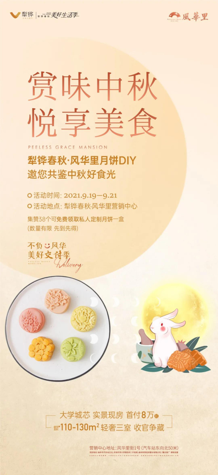 赏味中秋,悦享美食。犁铧春秋风华里月饼DIY,邀您共鉴中秋好食光。大学城芯,实景现房,首付8万起。建筑面积约110-130㎡轻奢三室,收官争藏。活动时间:2021.9.19-9.21 活动地点:犁铧春秋风华里营销中心