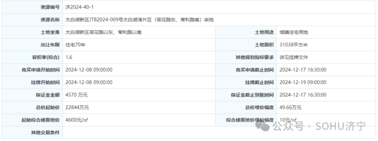 土地位于:太白湖新区荷花路以东、常利路以南;土地面积:31038㎡(约46.6亩);土地用途:城镇住宅用地;出让年限:住宅70年;容积率不大于1.6;起始价:22844万元,综合楼面价起价:4600元/㎡;