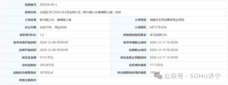 3. 任城区JRC2024-063号金塔片区(新华路以东香樟路以南)地块:2024年12月8日9时00分至2024年12月19日9时20分。