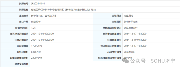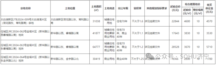 4. 任城区JRC2024-064号金塔片区(新华路以东金宇路以北)地块:2024年12月8日9时00分至2024年12月19日9时30分。