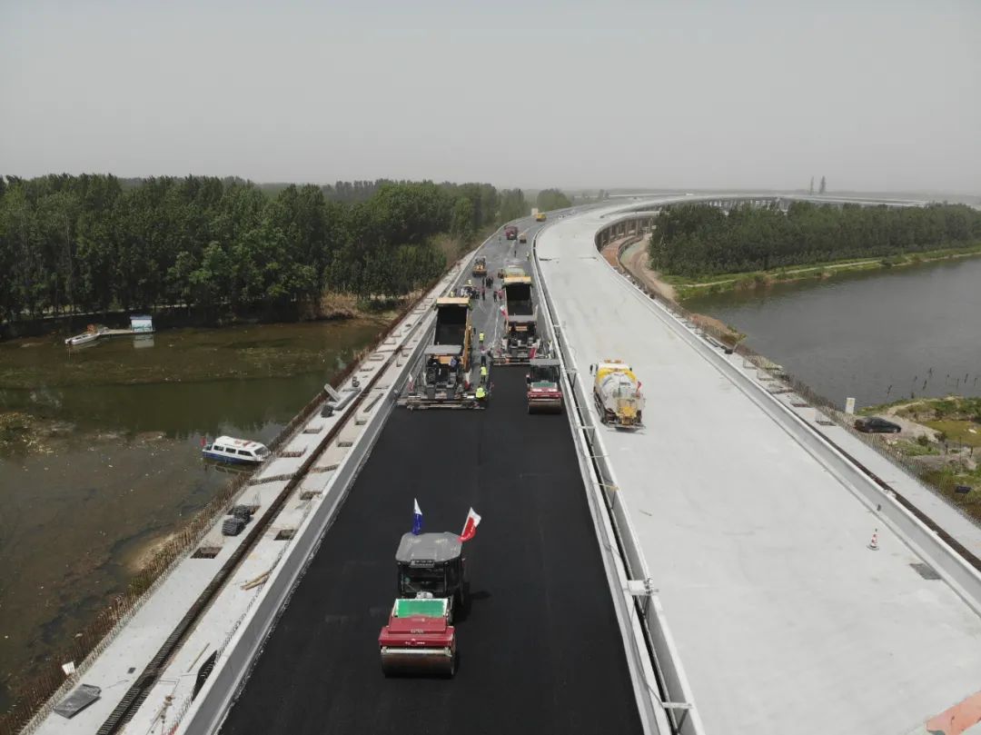 5月7日,济宁环湖大道东线工程太白湖新区段南二环互通主线桥右幅沥青下面层成功铺筑,标志着项目沥青路面施工正式拉开序幕。