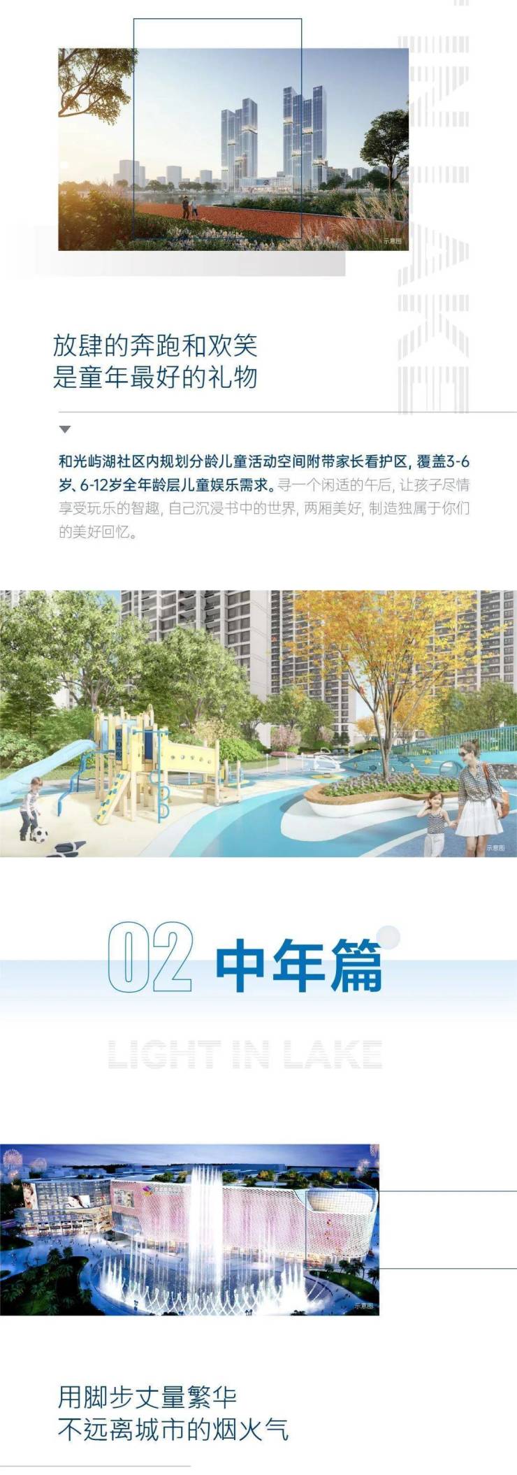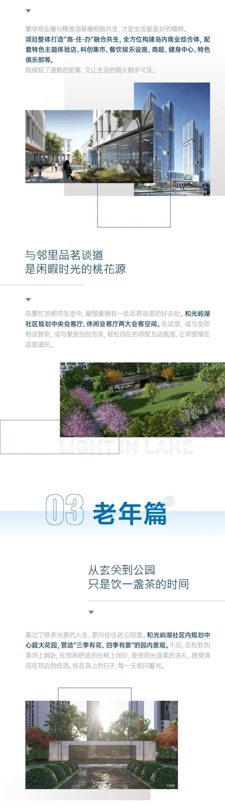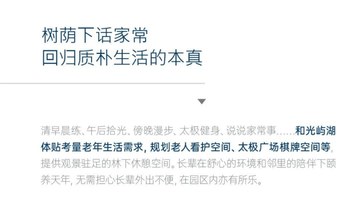 清早晨练、午后拾光、傍晚漫步、太极健身、说说家常事......和光屿湖体贴考量老年生活需求,规划老人看护空间、太极广场棋牌空间等提供观景驻足的林下休憩空间。长辈在舒心的环境和邻里的陪伴下颐养天年,无需担心长辈外出不便,在园区内亦有所乐