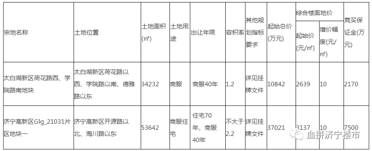 土地位于:济宁高新区开源路以北、海川路以东;土地面积:53642㎡(约80.5亩);土地用途:商住用地;出让年限:商业40年、住宅70年;容积率不大于2.2;起始价:37021万元,综合楼面价起价:3137元/㎡;