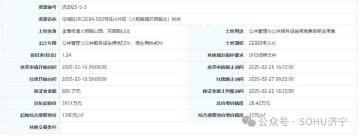 地块名:任城区JRC2024-092号任兴片区(火炬路西环翠路北)地块【济宁运河信诚建设发展有限公司竞得】