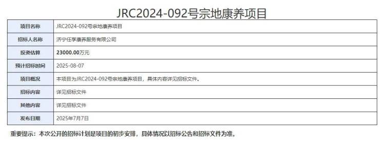 2025年7月7日,JRC2024-092号宗地康养项目招标计划发布。