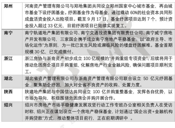除了明确“保交楼”,近期以来,多地政府牵头,联动地方AMC、地方国企等多种形式的国有资本,共同成立房地产纾困基金。