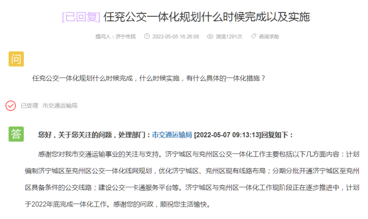 近日,搜狐网济宁小编在济宁市网络问政平台上注意到有网友提问:任兖公交一体化规划什么时候完成,什么时候实施,有什么具体的一体化措施?