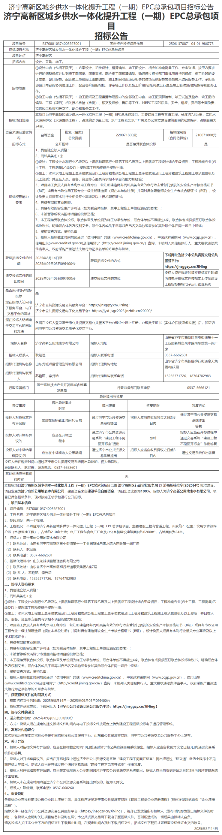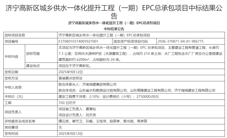 2025年8月14日,济宁高新区公共资源交易网站发布济宁高新区城乡供水一体化提升工程(一期)EPC总承包项目招标公告。项目招标内容为设计、采购、施工。总投资额约2.2亿元。
