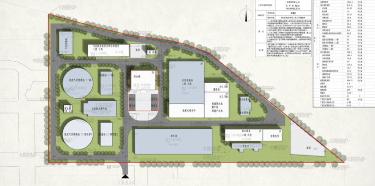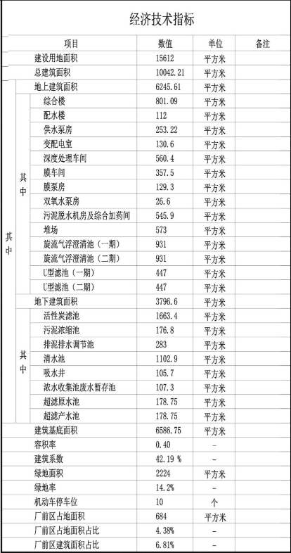 项目规划建设用地面积15612㎡(23.4亩);总建筑面积:10042.21㎡;其中,地上建筑面积:6245.61㎡,地下建筑面积3796.6㎡。容积率0.4;绿地率14.2%;建筑类型包括综合楼、配水楼、供水泵房、深度处理车间等;规划机动车停车位10个。