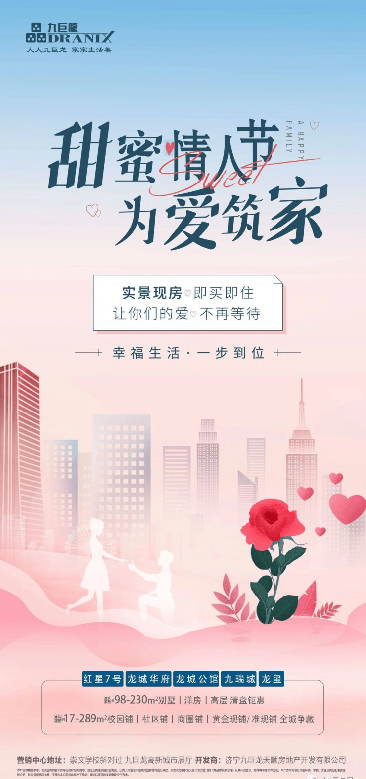 甜蜜情人节,为爱筑家。九巨龙·红星7号实景现房,即买即住,让你们的爱,不再等待,幸福生活一步到位。建面约98-230㎡别墅、洋房、高层,清盘特惠。建面约17-289㎡校园铺、社区铺、商圈铺、黄金现铺/准现铺,全城争藏!