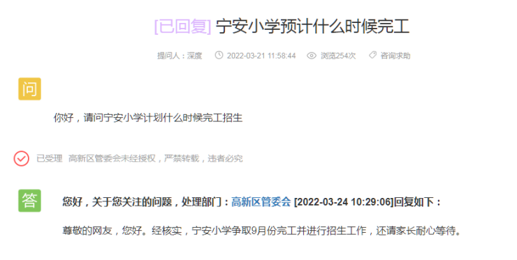 对此,济宁高新区管委会回复如下:经核实,宁安小学争取9月份完工并进行招生工作,还请家长耐心等待。