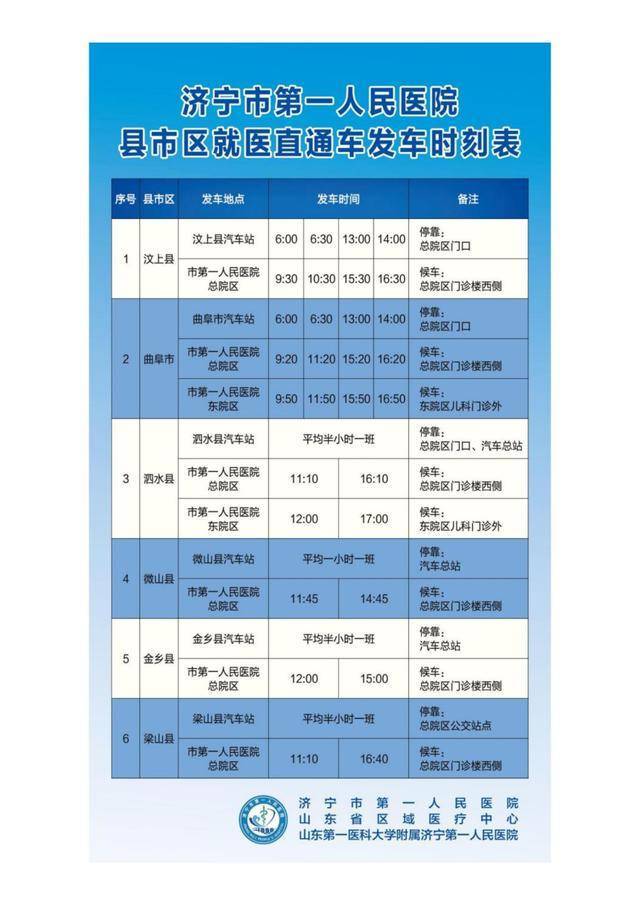 为进一步改善就医出行环境,解决县区患者来济就医交通困难、停车困难等问题,让群众就医更方便快捷、省心舒心,济宁市第一人民医院联合济宁交运集团开通曲阜市、泗水县至医院东院区、总院区和汶上县、微山县、金乡县、梁山县至总院区的就医直通车(具体收费标准以济宁交运集团公布为准),让群众就医更方便快捷、省心舒心。