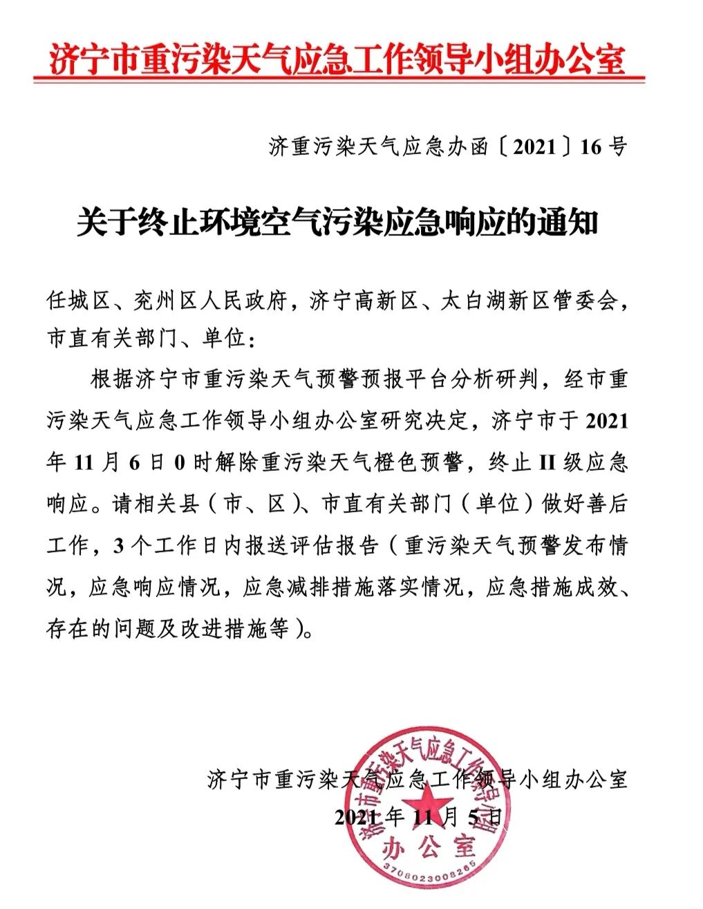 根据济宁市重污染天气预警预报平台分析研判,经市重污染天气应急工作领导小组办公室研究决定,济宁市于2021年11月6日0时解除重污染天气橙色预警,终止II级应急响应。