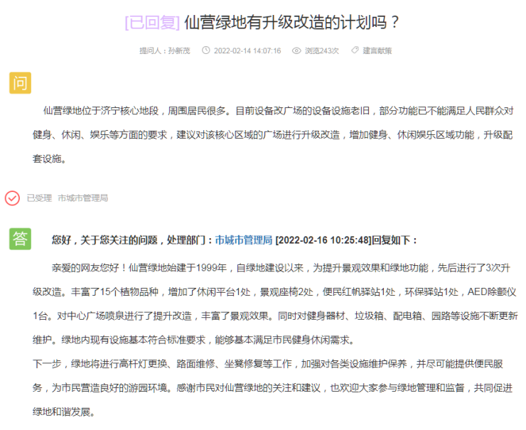 济宁城区仙营绿地是否有升级改造计划?较新官方回复来了