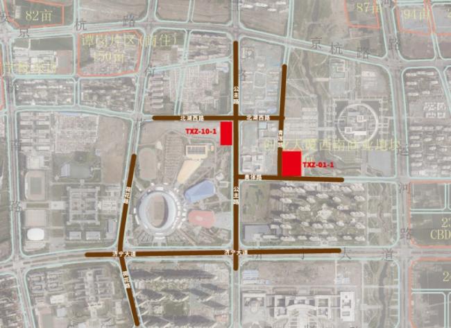 太白湖新区本次拟拍卖的两个地块基本情况为:TXZ-10-1地块东邻公主路、北邻北湖西路;TXZ-01-1地块西邻青莲路、南邻奥体路。(见下图)