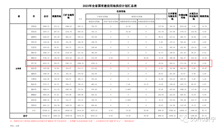 搜狐网济宁小编相关渠道获悉:11月27日,山东省自然资源厅发布2023年全省国有建设用地供应计划汇总表。其中,济宁市合计用地4615.32公顷,商服用地:220.67公顷;工矿仓储用地:1281.53公顷;住宅用地:1069.35公顷(含商品住宅用地:1030.12公顷;其他住宅用地:39.24公顷);公共管理与服务用地:264.21公顷;交通运输用地:1711.64公顷;水域及水利设施用地:67.93公顷。具体情况如下: