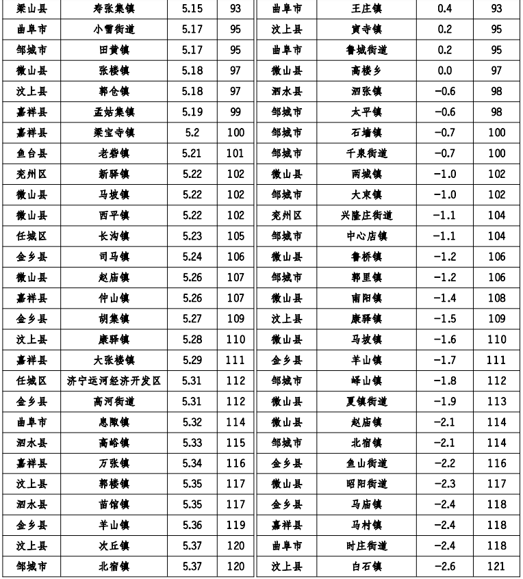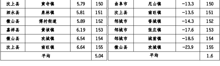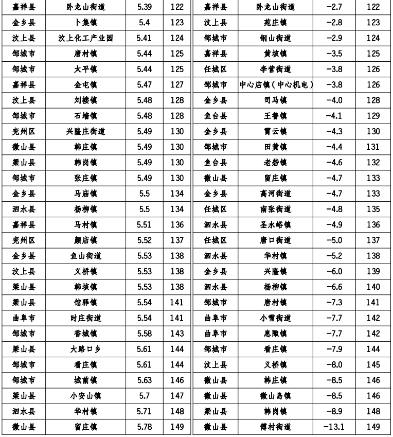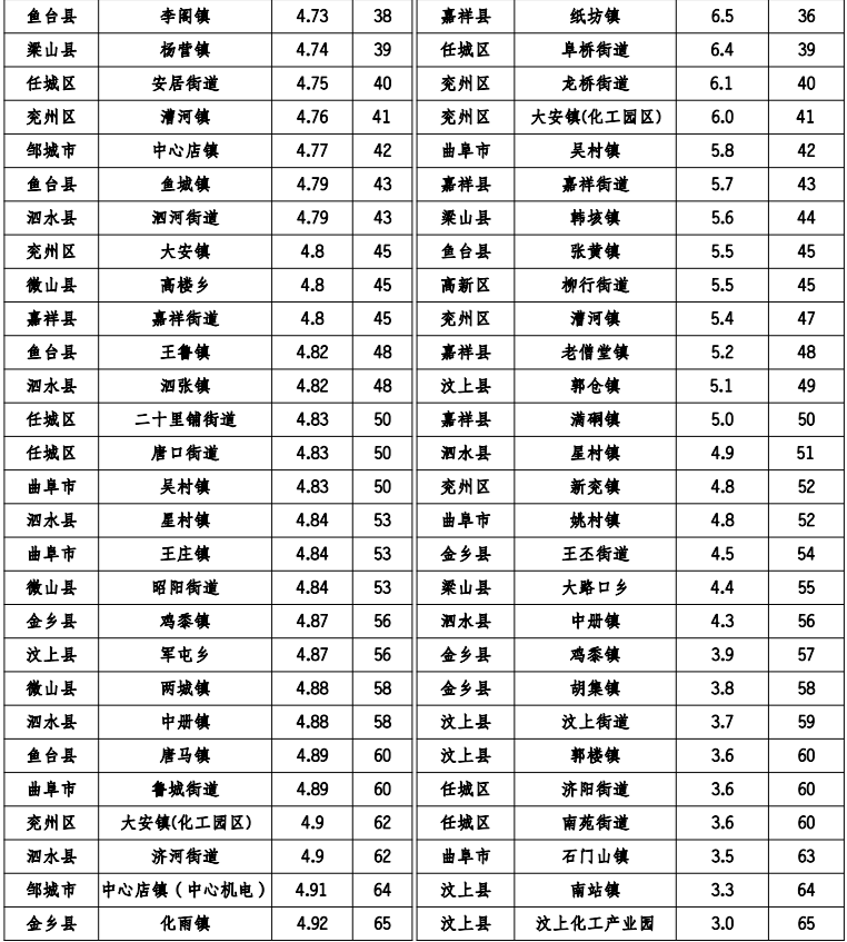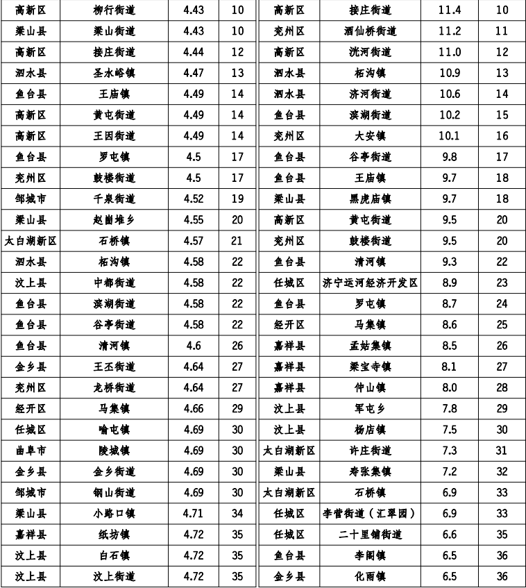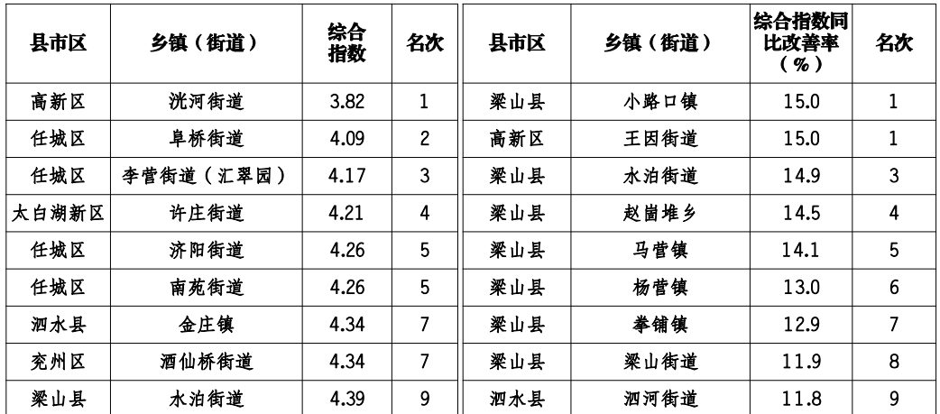 汶上县南旺镇、微山县欢城镇、微山县傅村街道、邹城市城前镇、邹城市看庄镇、邹城市香城镇、泗水县华村镇、汶上县义桥镇月度环境空气质量综合指数及同比改善率排名同时位居后20 位。具体排名情况如下: