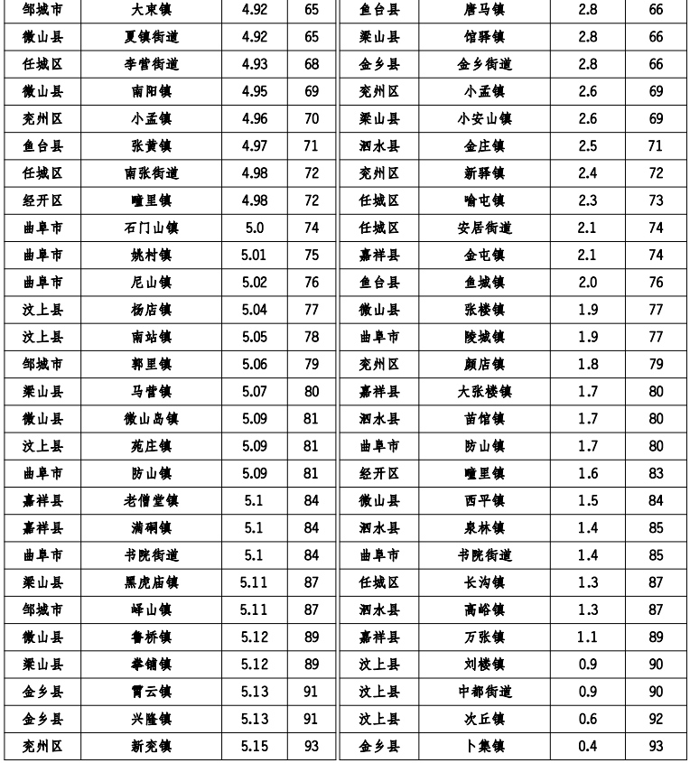 汶上县南旺镇、微山县欢城镇、嘉祥县黄垓镇、微山县傅村街道、泗水县泉林镇、汶上县寅寺镇、微山县留庄镇、泗水县华村镇、梁山县小安山镇、邹城市城前镇、邹城市看庄镇、梁山县大路口乡、邹城市香城镇、曲阜市时庄街道、梁山县馆驿镇、梁山县韩垓镇、汶上县义桥镇、金乡县鱼山街道、兖州区颜店镇、嘉祥县马村镇。