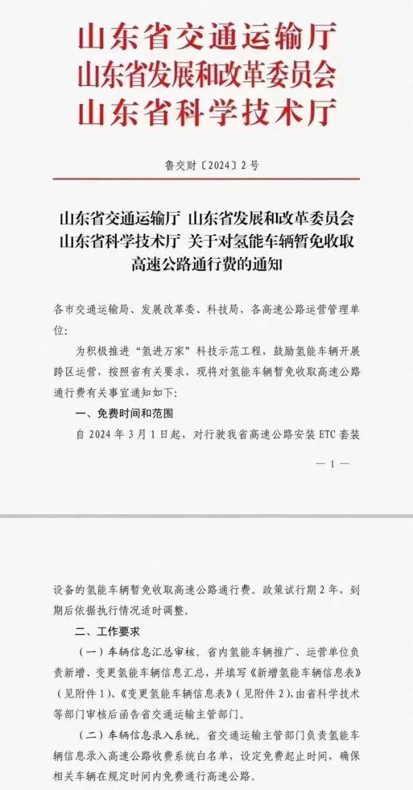 搜狐网济宁小编了解到:近日,山东省交通运输厅、山东省发展和改革委员会、山东省科学技术厅联合发布《关于对氢能车辆暂免收取高速公路通行费的通知》。