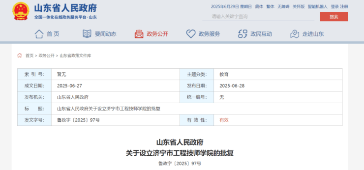 6月28日,山东省人民政府网站发布关于设立济宁市工程技师学院的批复,全文如下: