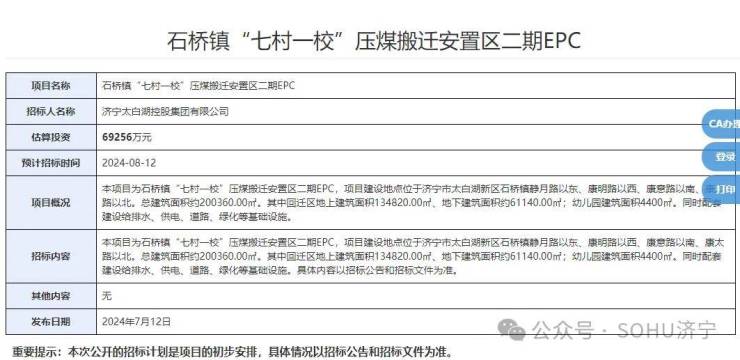 近日,搜狐网济宁小编相关渠道获悉:济宁市太白湖新区石桥镇“七村一校”压煤搬迁安置区二期EPC项目开始招标,预估投资为69256万元,具体如下。