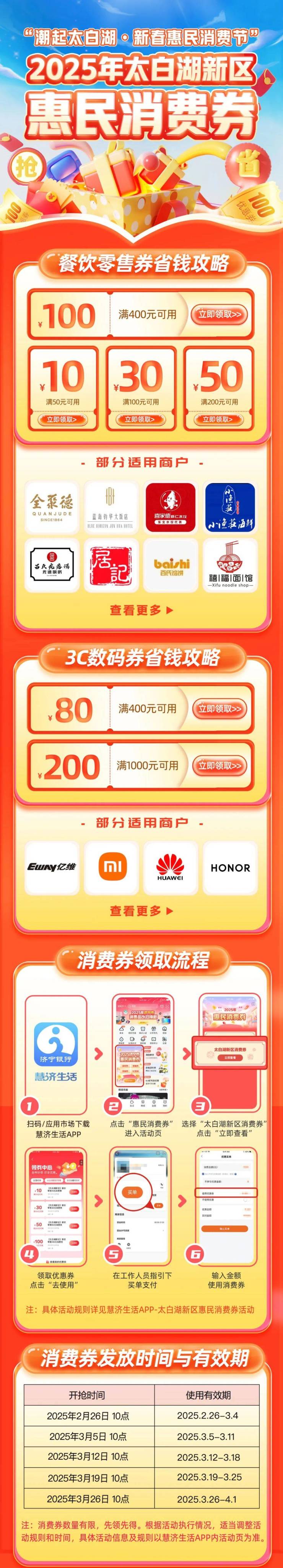 从本周开始,太白湖新区新春惠民消费券发放时间调整为每周三上午10点准时发放。请大家提前做好准备,准时在慧济生活APP的活动专区领取消费券。