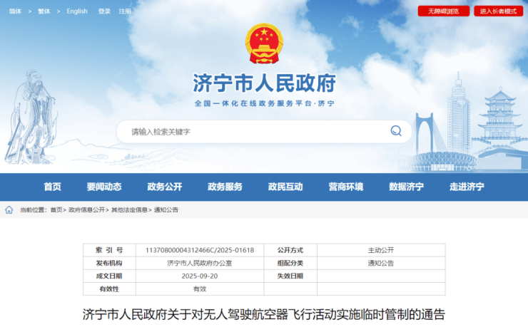 济宁市发布通告!对无人驾驶航空器飞行活动实施临时管制