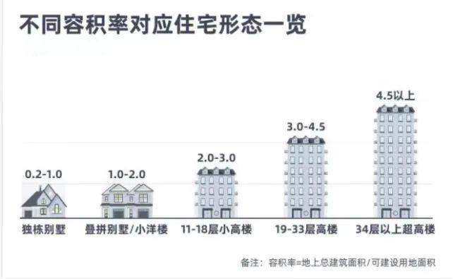 先来看看和居住舒适度挂钩的各项基础指标。其一,容积率。容积率是指一个小区的地上总建筑面积与用地面积的比值,一般来说,和住宅产品形态密切相关: