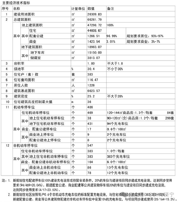项目规划用地面积26309.83平方米(约39.5亩);总建筑面积:66261.79㎡;其中,地上建筑面积为47298.72㎡(含住宅44608.67㎡、商业1423.54㎡、配套公建1266.51㎡)、地下建筑面积为18963.07㎡(含地下车库15150㎡、储藏室3813.07);容积率为1.80;建筑密度25.2%;绿地率30.4%;计划总居住户(套)数为383户(套),居住人数约1226人(按3.2人/户预算);建筑类型包括住宅、商业、公共配套设施等;规划机动车停车位486个(地上车位55个,地下车位431个),非机动车位547个。