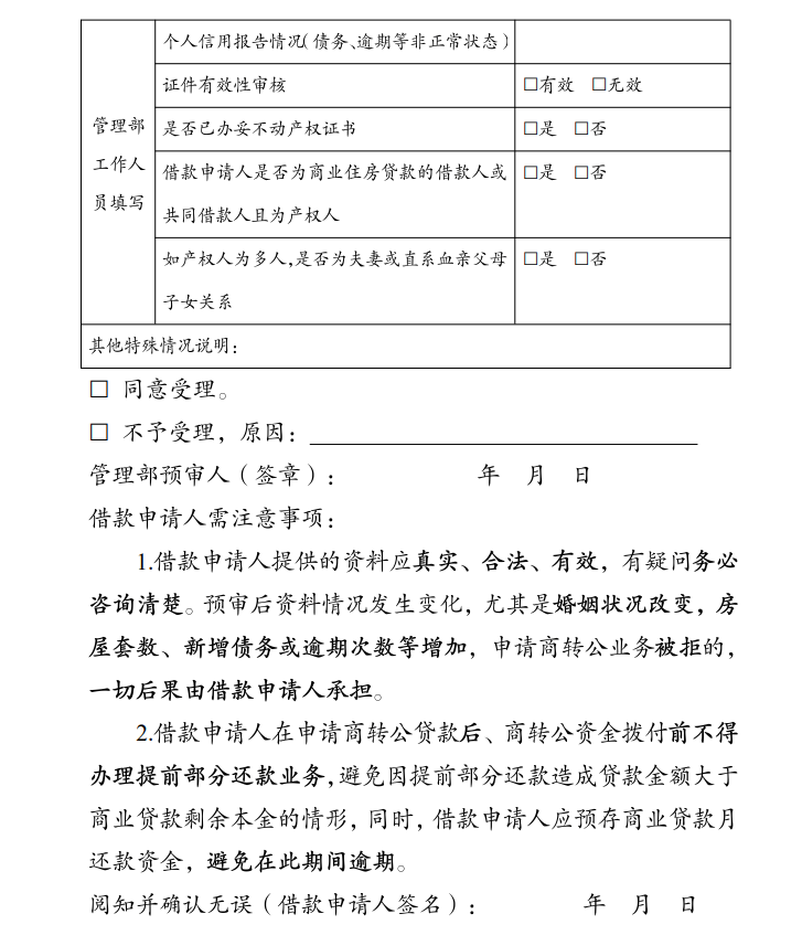 选择带押转贷或带押转组合模式的,借款申请人应向商业贷款银行征求意见,商业贷款银行同意的,携带《商转公银行意见书》(附件2)向中心或中心贷款业务合作行申请办理商转公贷款,经审核确认具备商转公贷款资格的,中心或中心贷款业务合作行应出具《商转公贷款预审确认单》(附件1)。