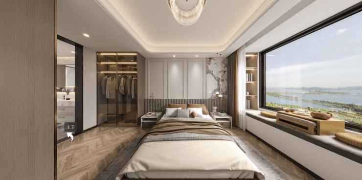 主卧套房空间,配备独立卫浴、景观飘窗设计,轩阔空间让居者身心放松,感受自我独处时的惬意优雅,尽享私密静谧。