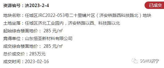 土地位于:任城区济北工业园内,济安桥路以西、科技路以北;土地面积:9998㎡(约15亩);土地用途:工业用地;出让年限:50年;容积率不小于1.0;起始价:285万元,综合楼面价起价:285元/㎡;最终成交价为:285万元(约36万元/亩),综合楼面地价成交价:285元/㎡;溢价率:0.0%;
