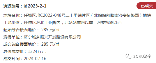 土地位于:任城区济北工业园内,北站站前路以南、济安桥路以西;土地面积:46423㎡(约70亩);土地用途:工业用地;出让年限:50年;容积率不小于1.0;起始价:1324万元,综合楼面价起价:285元/㎡;最终成交价为:1324万元(约19万元/亩),综合楼面地价成交价:285元/㎡;溢价率:0.0%;