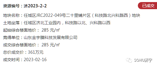 地块二:任城区JRC2022-049号二十里铺片区(科技路北兴科路西)地块【山东金宇膜科技发展有限公司竞得】