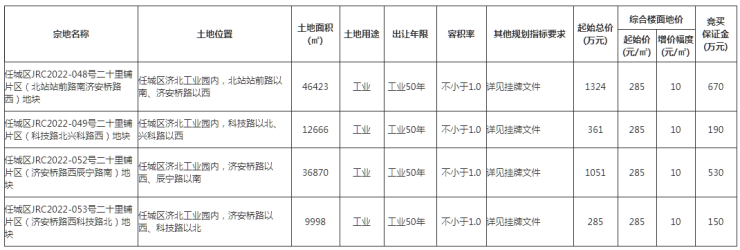 任城区挂地!搜狐网济宁小编从济宁市自然资源和规划局了解到:经济宁市人民政府批准,济宁市自然资源和规划局决定以网上挂牌方式出让任城区4宗国有建设用地使用权,土地用途均为工业用地;土地面积105957㎡,约159亩;起始价为3021万元。经竞价后,地块全部成交,最终成交价为3021万元。