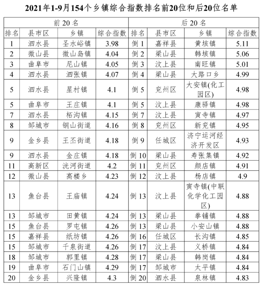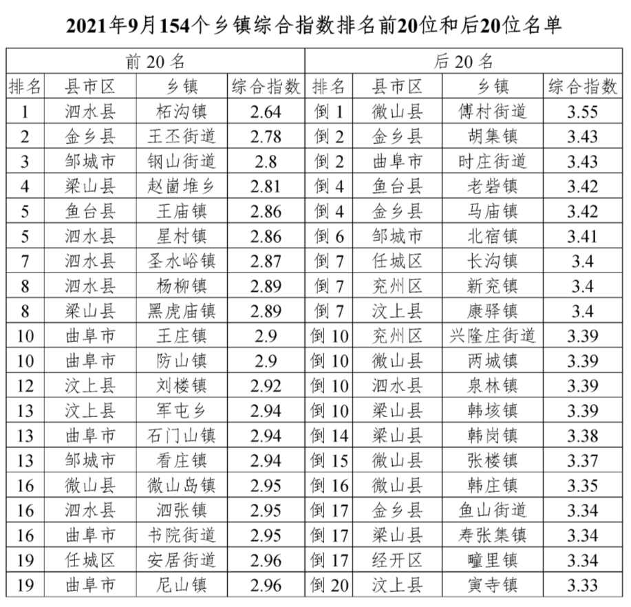 综合指数位列全市后20位的乡镇是:微山县傅村街道、曲阜市时庄街道、金乡县胡集镇、金乡县马庙镇、鱼台县老砦镇、邹城市北宿镇、汶上县康驿镇、兖州区新兖镇、任城区长沟镇、梁山县韩垓镇、泗水县泉林镇、微山县两城镇、兖州区兴隆庄街道、梁山县韩岗镇、微山县张楼镇、微山县韩庄镇、经开区疃里镇、梁山县寿张集镇、金乡县鱼山街道、汶上县寅寺镇。