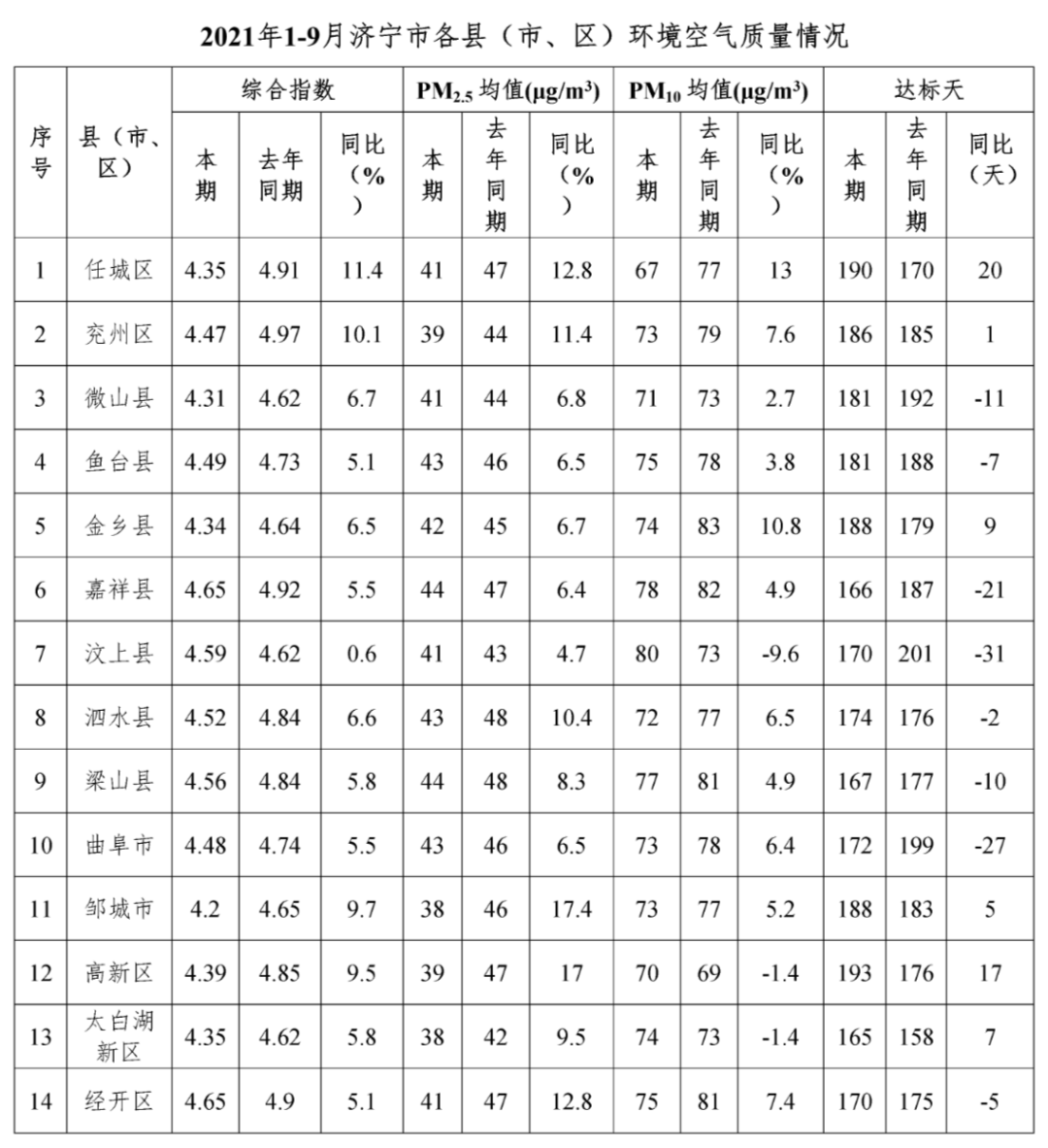 近日,济宁市生态环境局公布了2021年9月和1–9月全市及各县市区环境空气质量状况,详细内容如下: