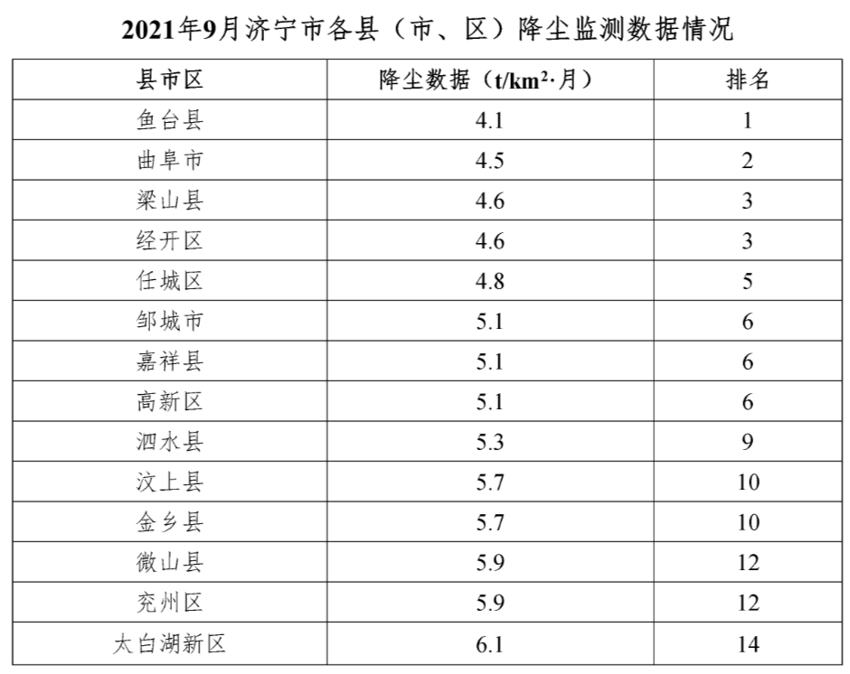 9月全市降尘量平均为5.2t/km2·月,14个县市区降尘量由低到高排名,前三名分别是:鱼台县排名前列名、曲阜市第二名、梁山县和经开区并列第三名;后三名分别是:太白湖新区倒数排名前列名、兖州区和微山县并列倒数第二名。