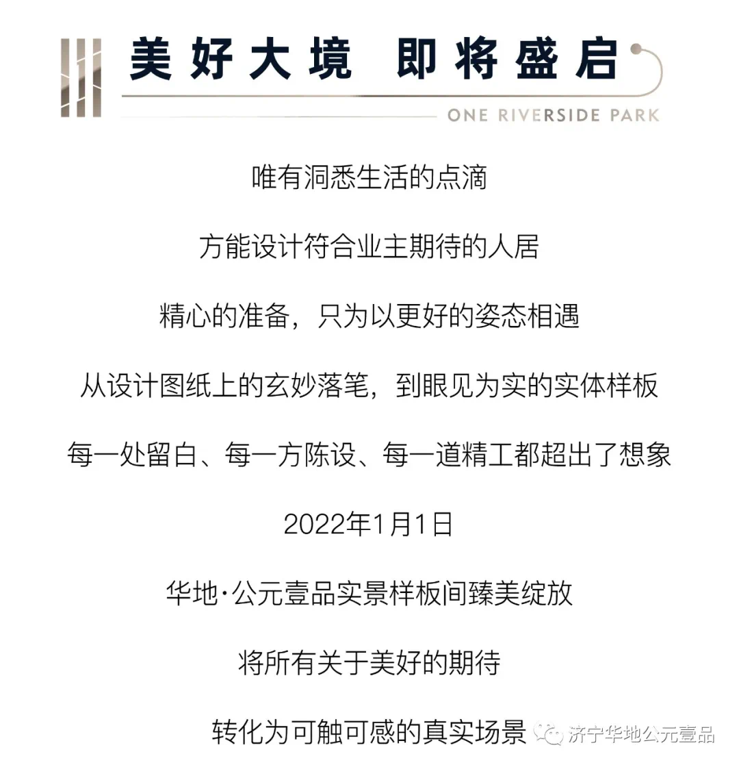 所有真挚的等待,都是为了更好地遇见。济宁华地公元壹品坚持匠心品质,致力打造城市精英人居作品。致敬时代品味生活,实景样板间臻情绽放,静候君临。