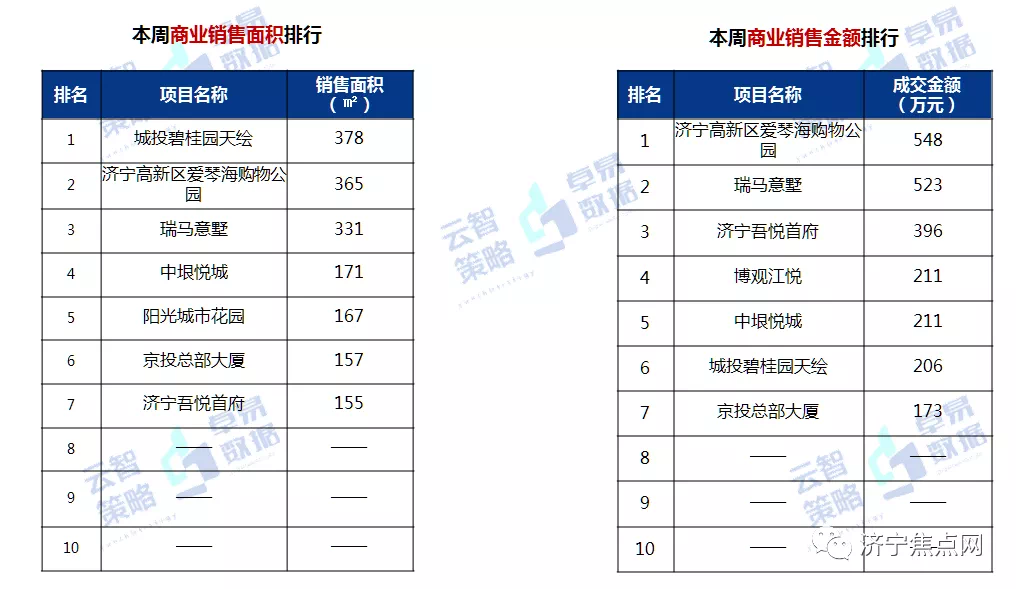 本周城投碧桂园天绘项目以销售面积378㎡,位居商业销售面积排行榜排名前列,济宁高新区爱琴海购物公园项目以销售金额548万元,位居商业销售金额排行榜排名前列。