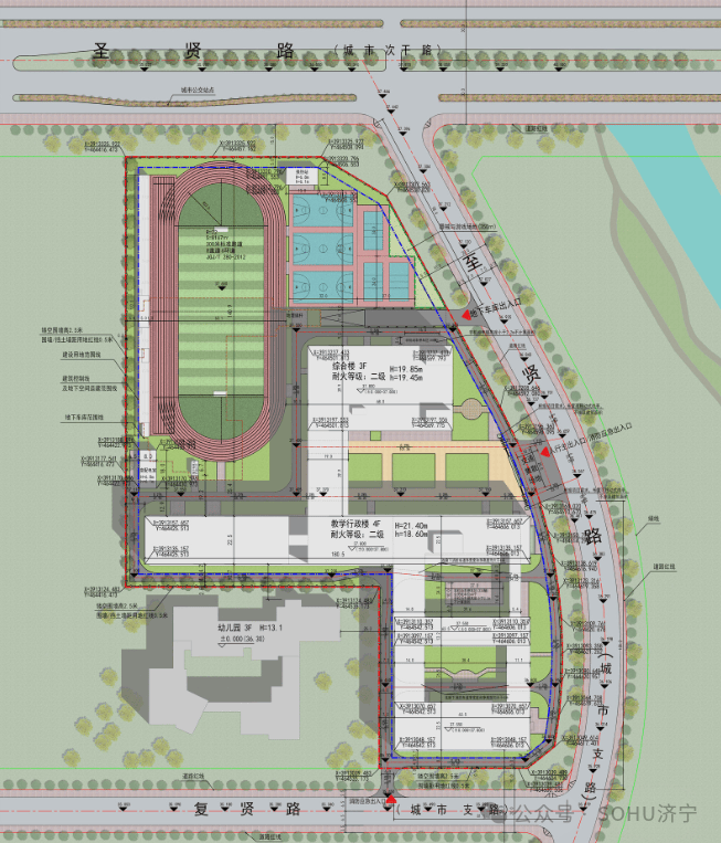 建筑类型包括教学行政楼(4层)、综合楼(3层)、配套公建等;同时建设配套管网、道路操场、绿化等工程;规划机动车停车位99个(全部为地下机动车停车位),非机动车位380个。