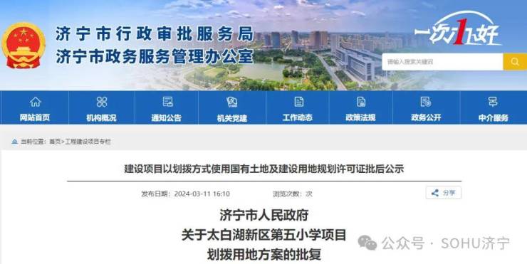 你局《关于太白湖新区第五小学项目划拨用地方案的请示》(济审服呈〔2024〕4号)收悉。经研究,批复如下: