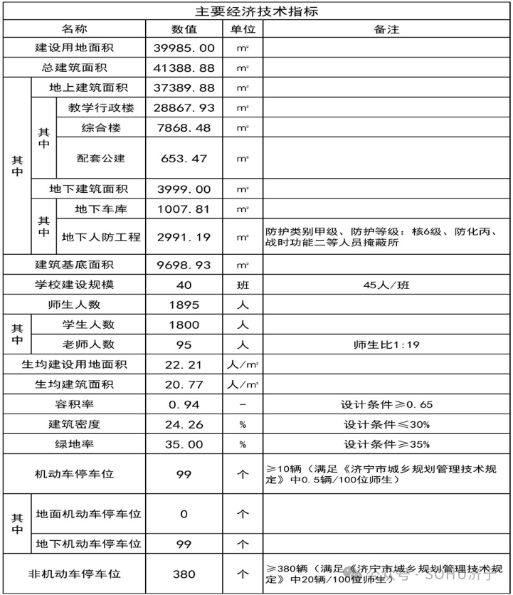 学校建设规模:40个班(45人/班);师生人数:1895人,其中学生人数1800人,老师人数95人(师生比1:19);生均建设用地面积:22.21㎡/人,生均建筑面积:20.77㎡/人;