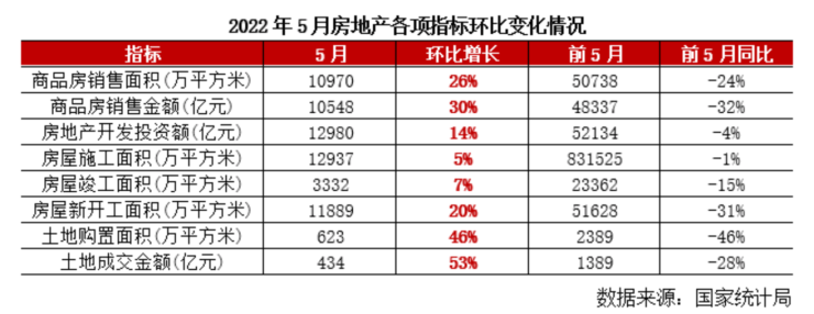 截至6月12日,2022年全国累计175个省市出台了299次调控政策,共627条。同时,5月全国商品房销售均价为9615元/平方米,环比上涨3%。因此5月商品房销售实现触底环比回升,主要原因是各省市的调控放松政策“应出尽出”,频率和力度有效地触动了购房者,放弃观望入市购房。从销售均价回升看,“以价换量”对销售规模回升贡献度较低。5月商品房销售规模在年内首次实现环比增长,共销售商品房10970万平方米和10548亿元,分别环比上涨26%和30%,同比分别下降31.8%和37.7%。