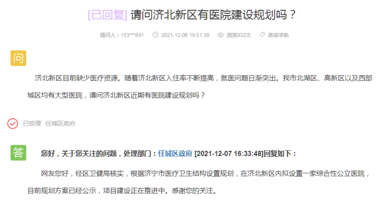 对此,任城区政府回复如下:经区卫健局核实,根据济宁市医疗卫生结构设置规划,在济北新区内拟设置一家综合性公立医院,目前规划方案已经公示,项目建设正在推进中。