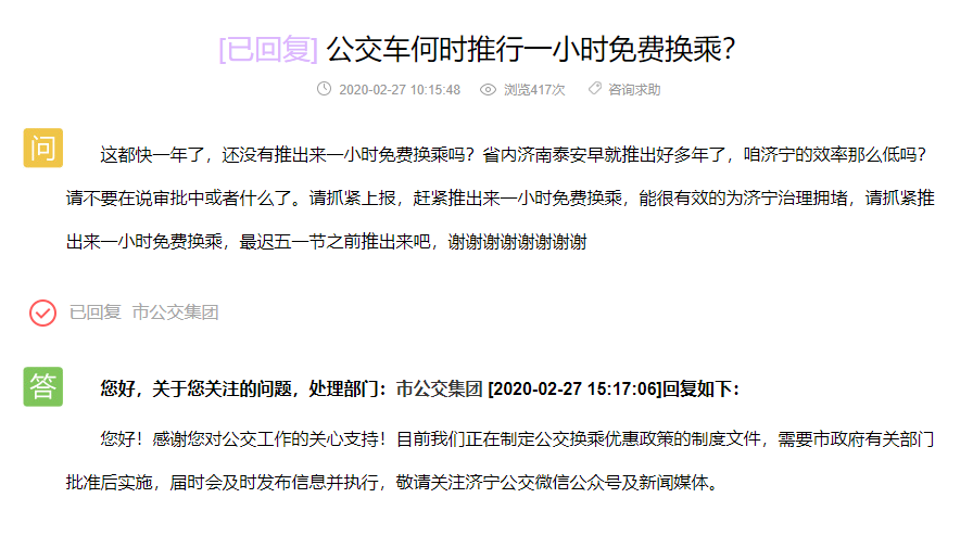 “山东省多地区都推出了公交车一小时免乘政策,咱济宁何时推出该惠民政策呢?”近日,有网友通过济宁市网络问政平台留言咨询,省内济南、泰安市早已推出公交车一小时免费换乘惠民政策了,有效缓解了交通压力,那么请问咱济宁制定公交车一小时免费换乘计划了吗?何时可以推行?