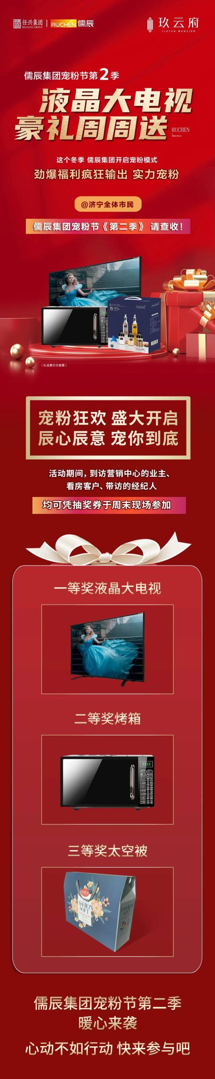 儒辰集团宠粉节第2季,液晶大电视,豪礼周周送。这个冬季,玖云府开启宠粉模式。劲爆福利疯狂输出,实力宠粉。玖云府建面约98-115㎡瞰景小高,建面约126㎡阔境洋房,特惠加推,轻松置业。
